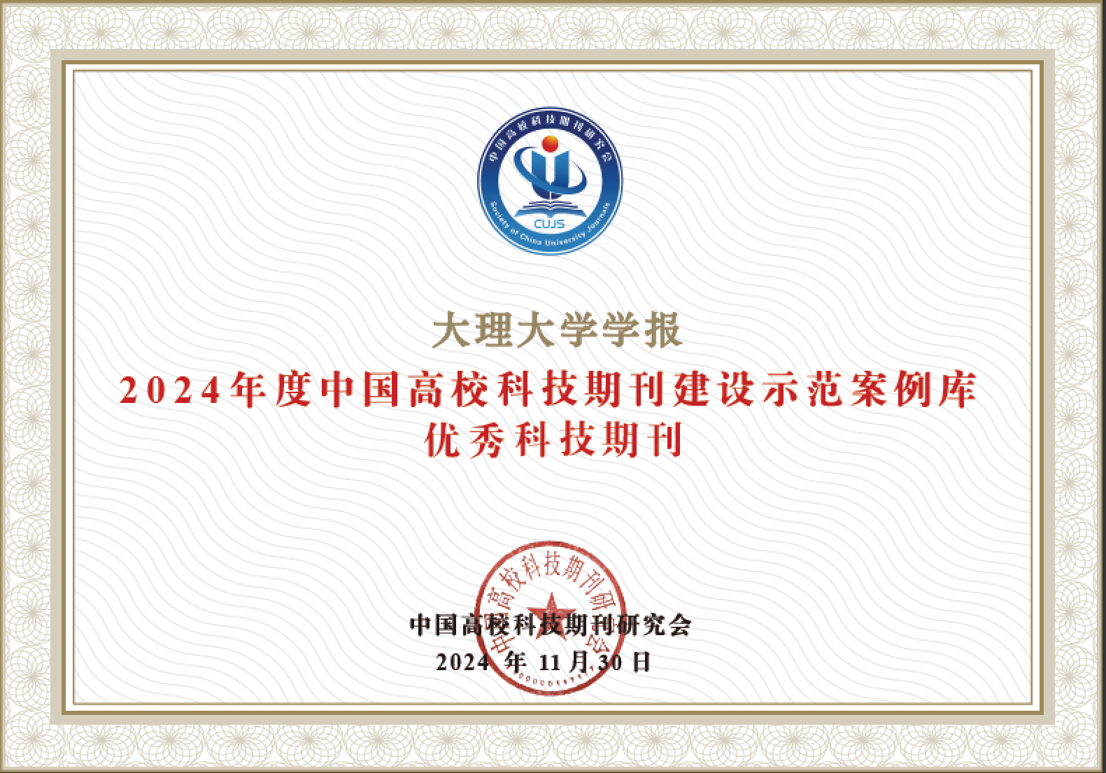 近日,《大理大学学报》成功入选2024年度中国高校科技期刊建设示范案例库优秀科技期刊。这一荣誉不仅是对《大理大学学报》长期以来坚守学术阵地、推动学科发展与知识创新的高度认可,更是对其在高校科技期刊建设领域所取得成果的有力见证。